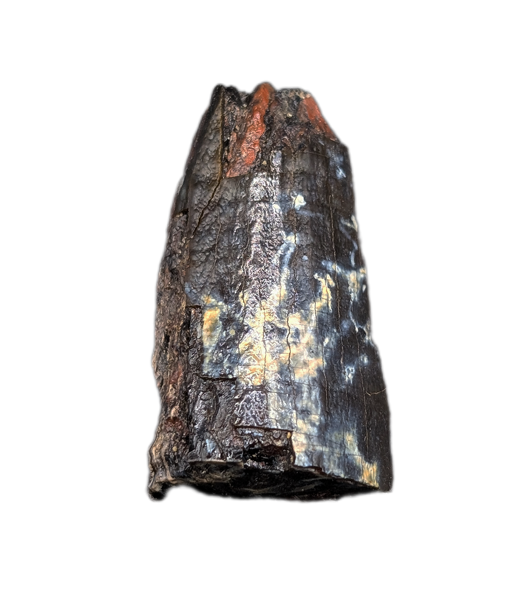 1" (2.54 cm) Allosaurus tooth from the Morrison Formation of Moffat County, Colorado.