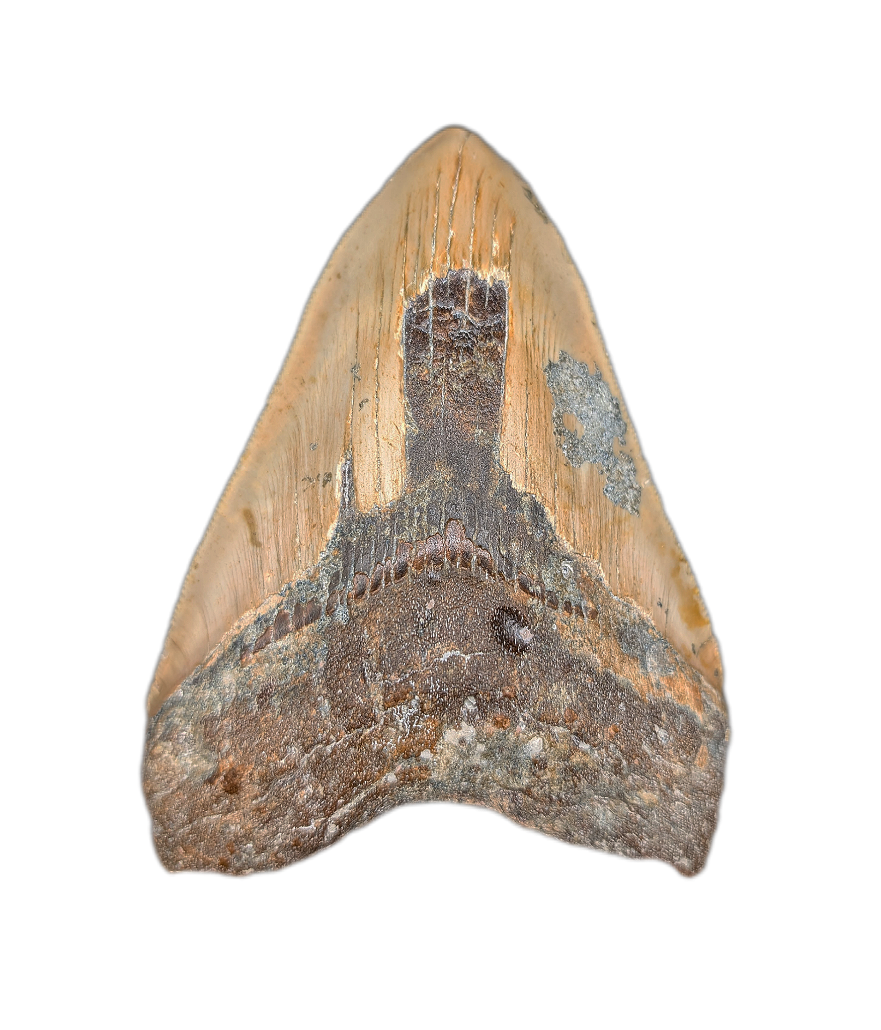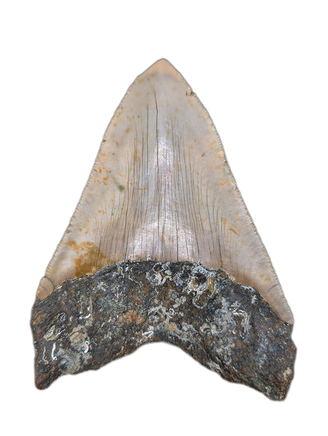 4.55" (11.56 cm) Megalodon tooth found off the coast of the Eastern United States. 2.5 to 15 million years old. Megalodon was likely the largest shark to have ever lived.