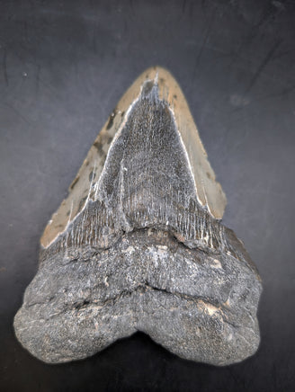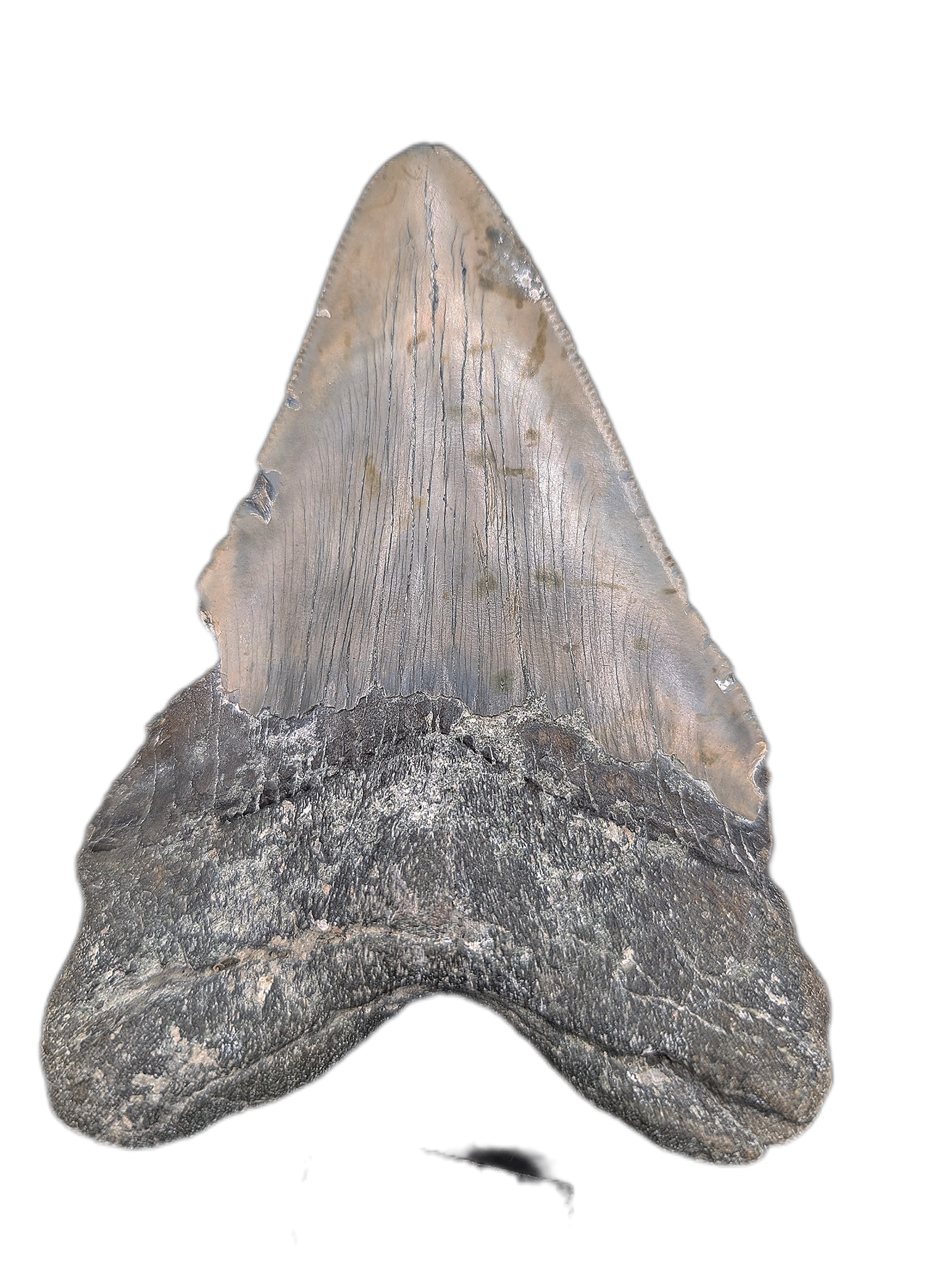5.1" (13 cm) Megalodon tooth found off the coast of the Eastern United States. 2.5 to 15 million years old. Megalodon was likely the largest shark to have ever lived.