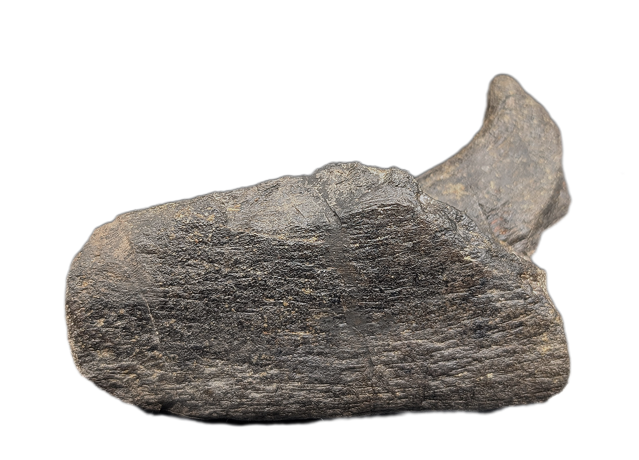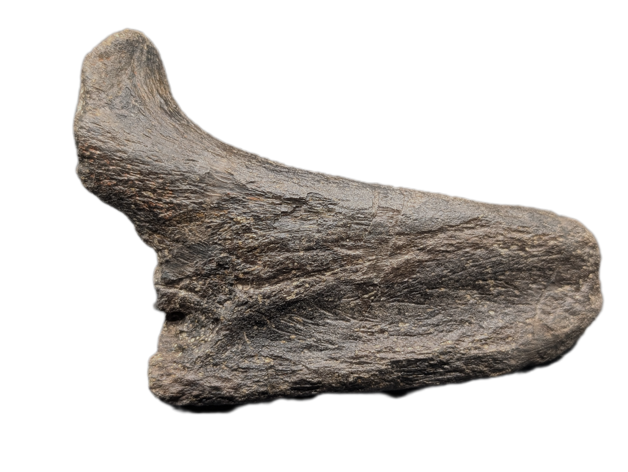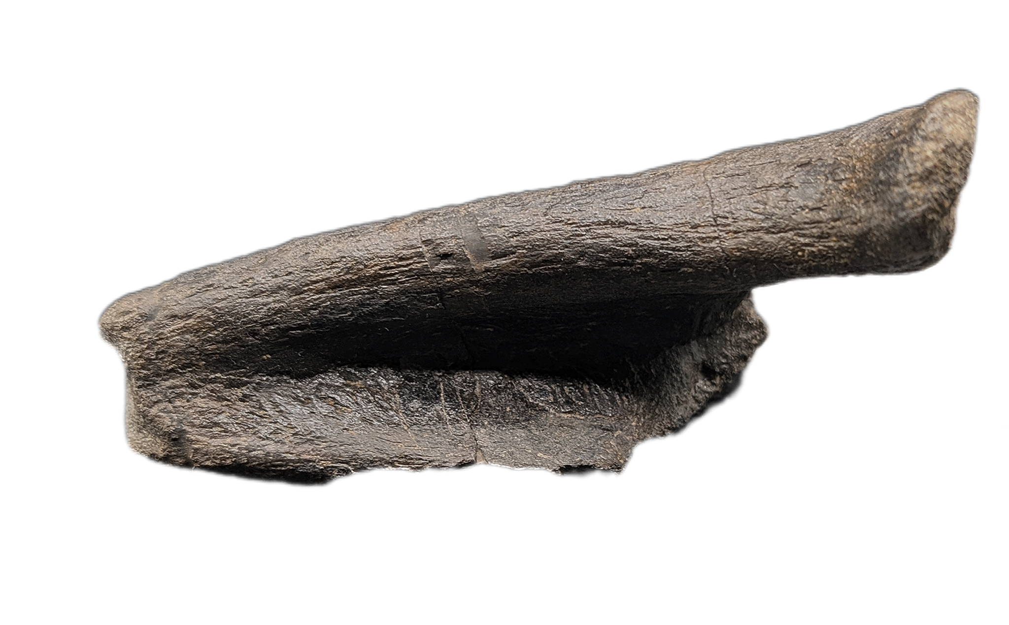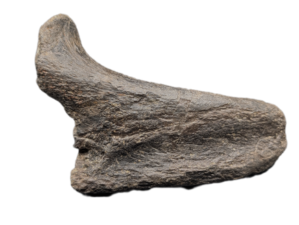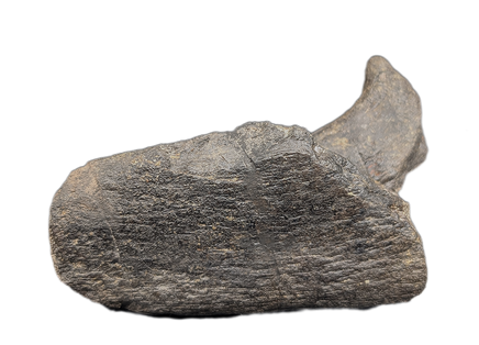 4.44" (11.28 cm) long, 2.75" (4.5 cm) wide, 2.9" (7.45 cm) tall; Hadrosaur jaw section from the Two Medicine Formation of Pondera County Montana. No restoration. 75 million years old. Comes with a custom stand.