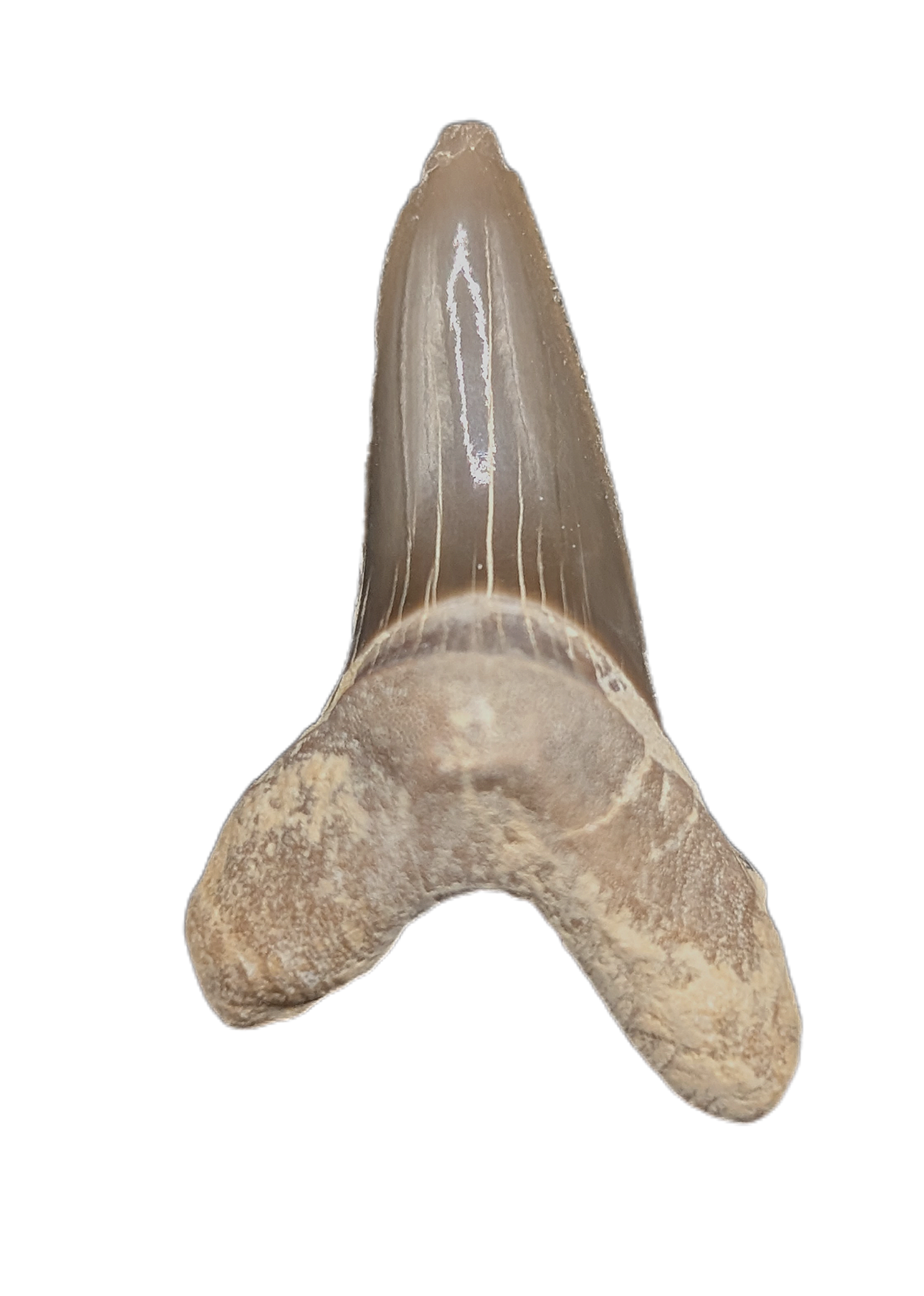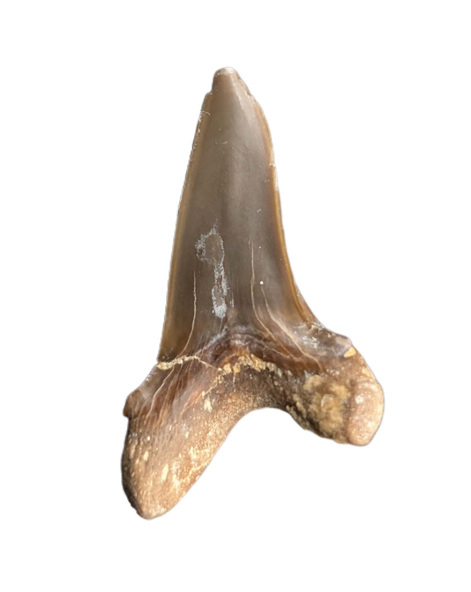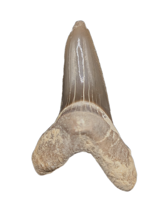 0.93" (2.4 cm) Scapanorhynchus shark tooth from the Niobrara Formation of Kansas. This shark swam the western interior seaways 87-82 million years ago.