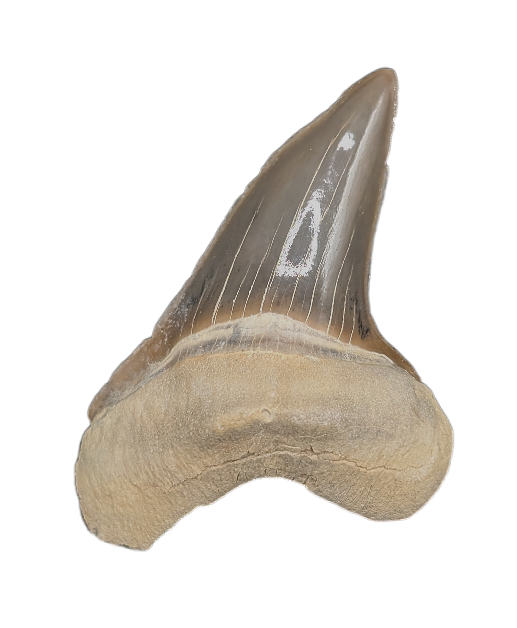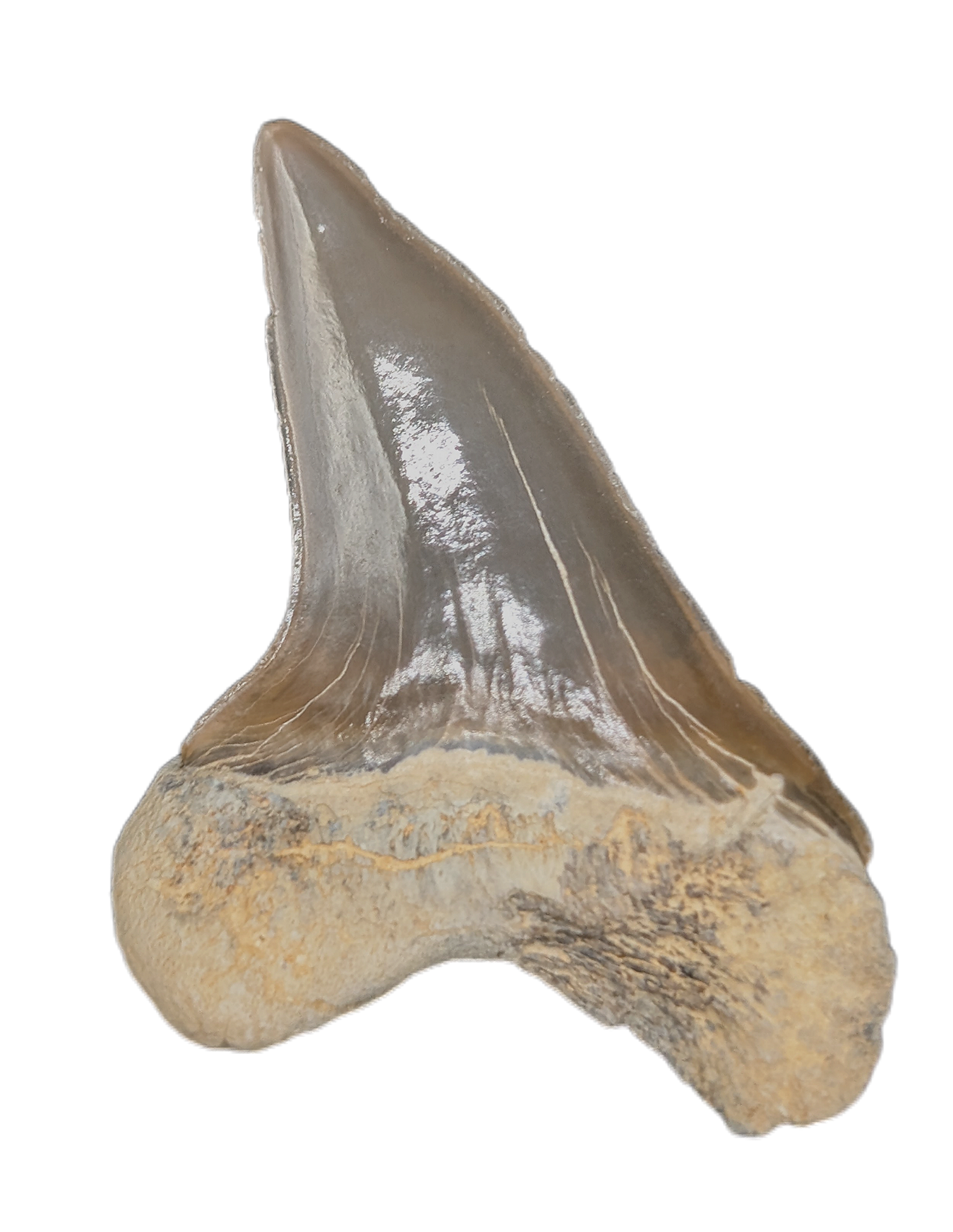 1.56" (3.97 cm) Cretoxyrhina shark tooth from the Niobrara Formation of Kansas. This shark swam the western interior seaways 87-82 million years ago.